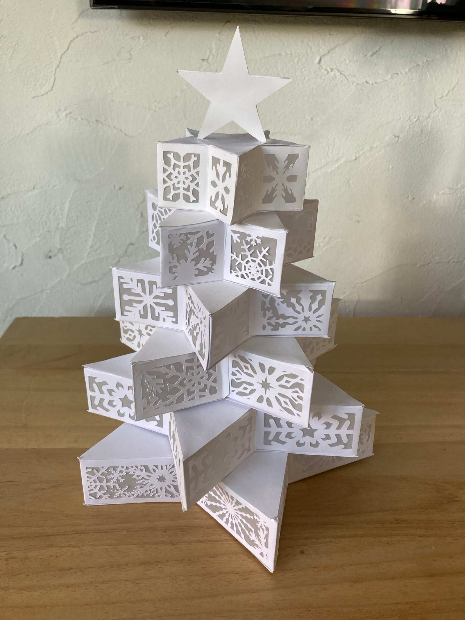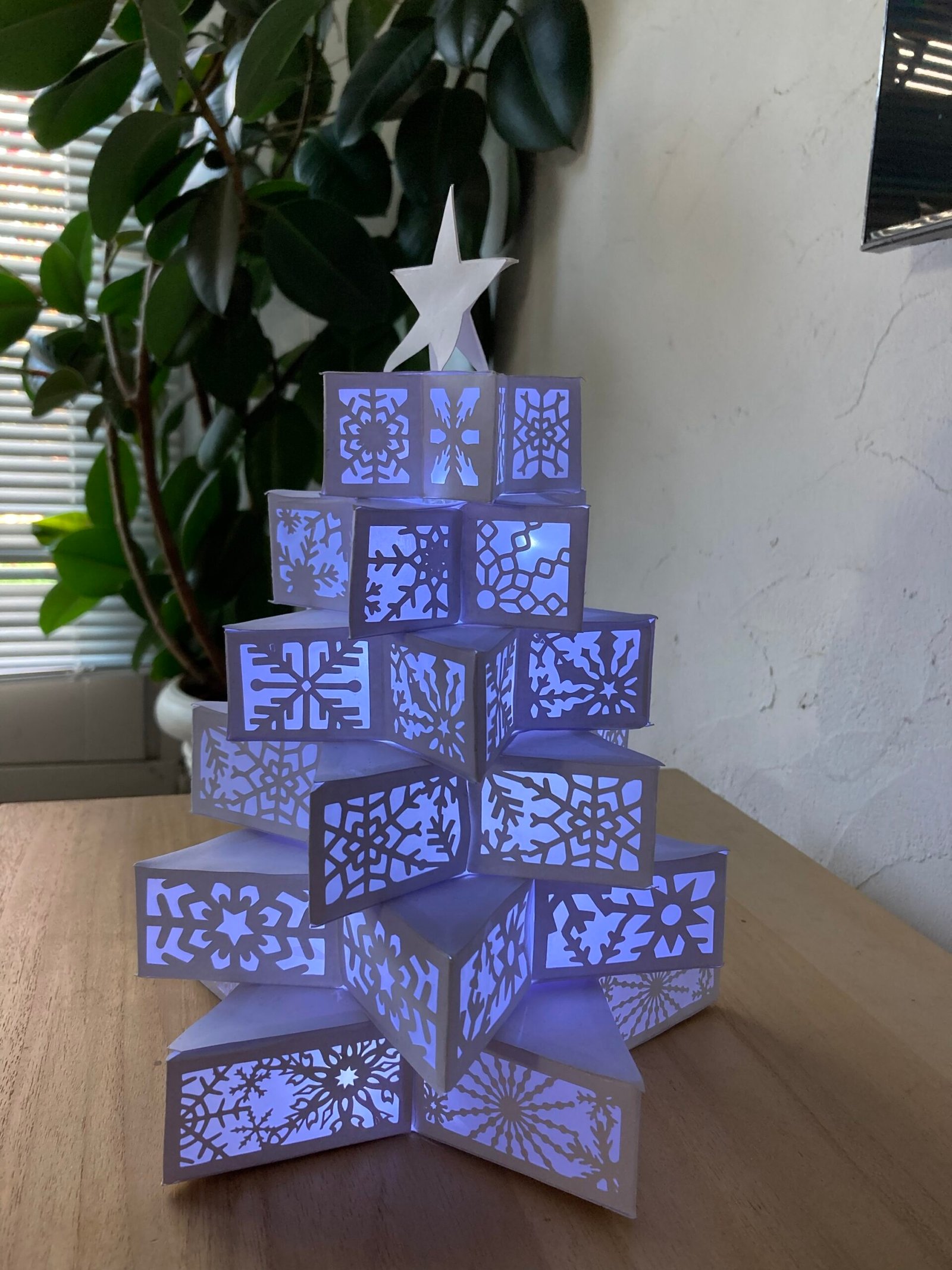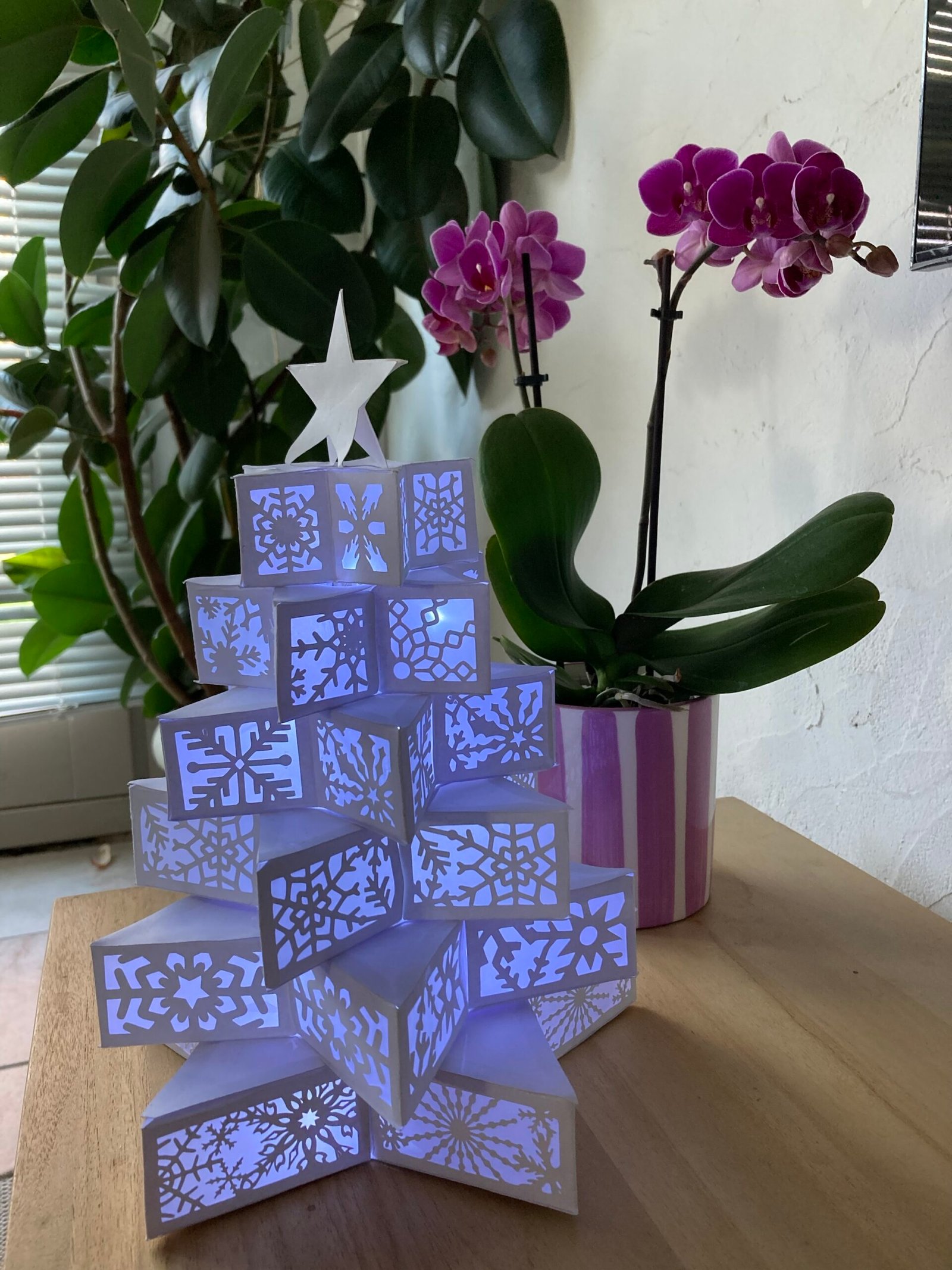 Étoile de Noël réalisée en papier cartonné blanc. Elle comprend une guirlande à led avec interrupteur placée à l’intérieur.