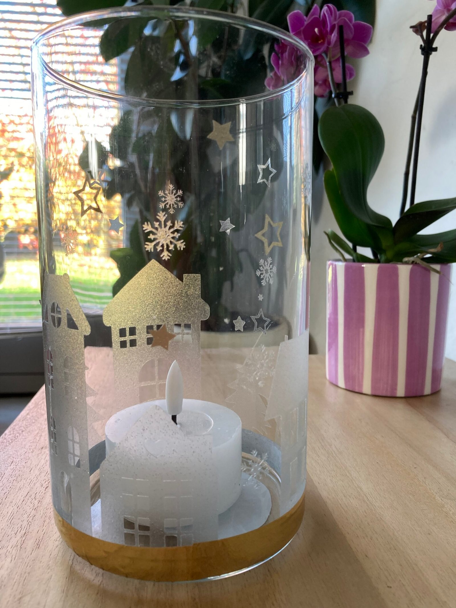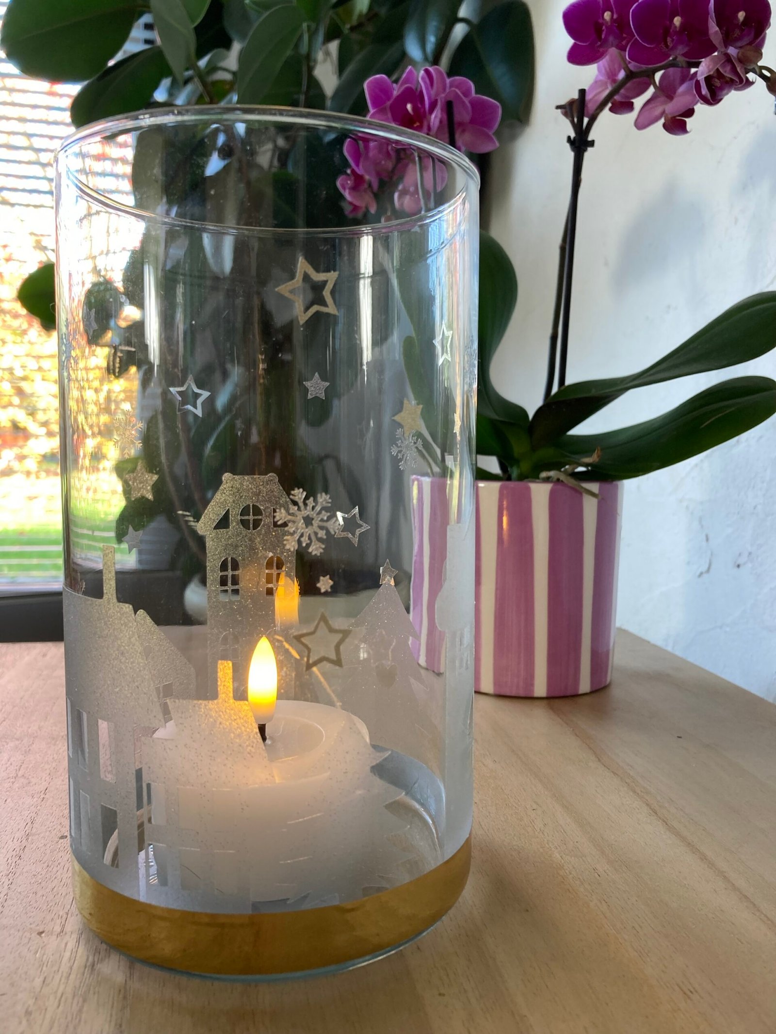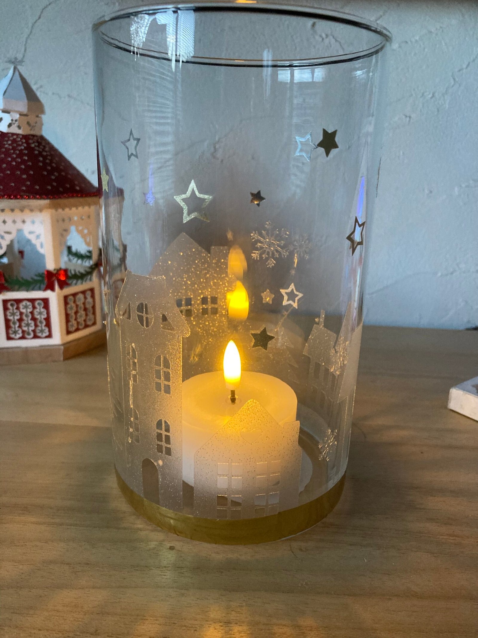 Vase en verre avec décoration transparente pailletée représentant un village.Fournis avec une bougie led.