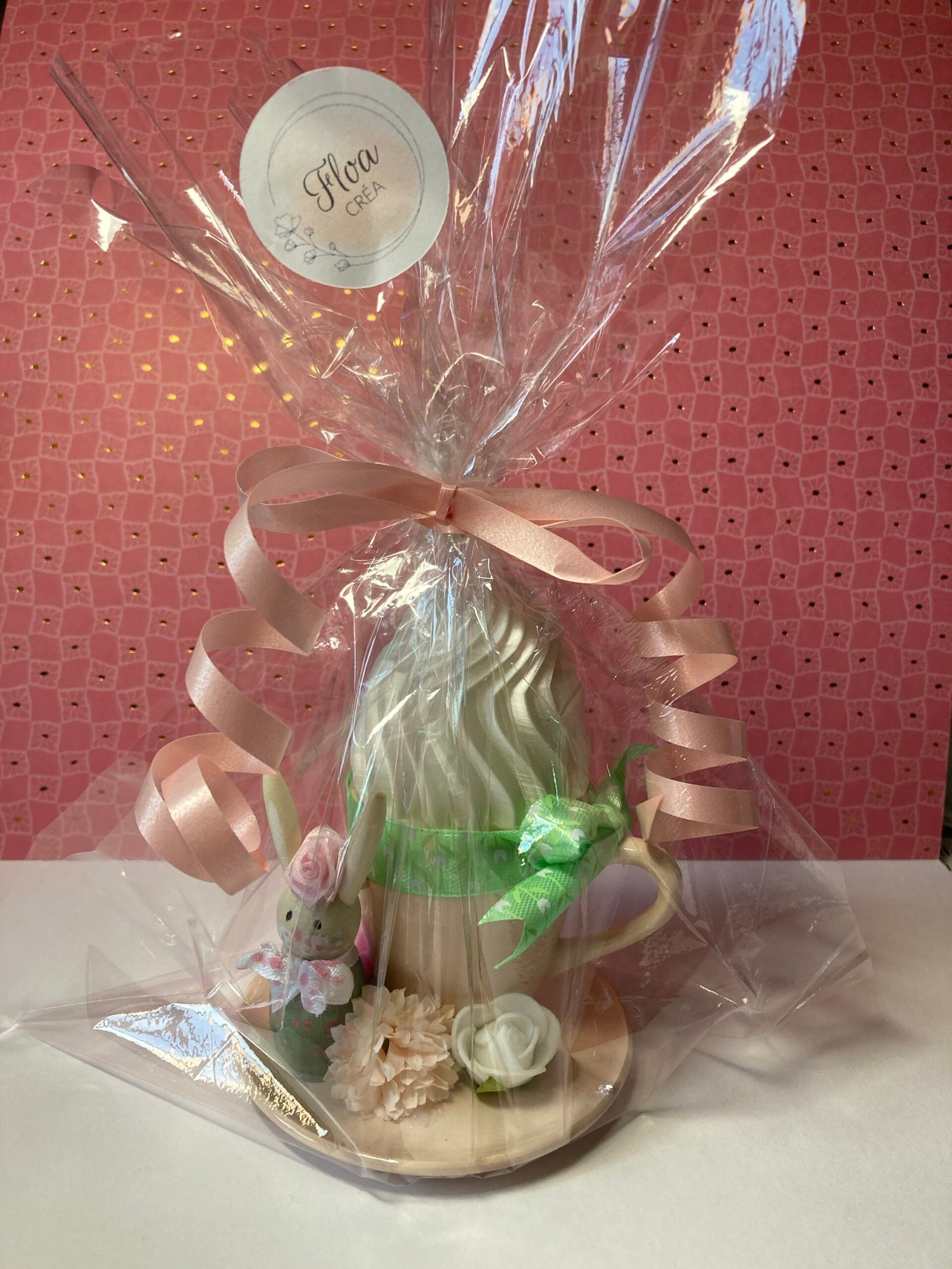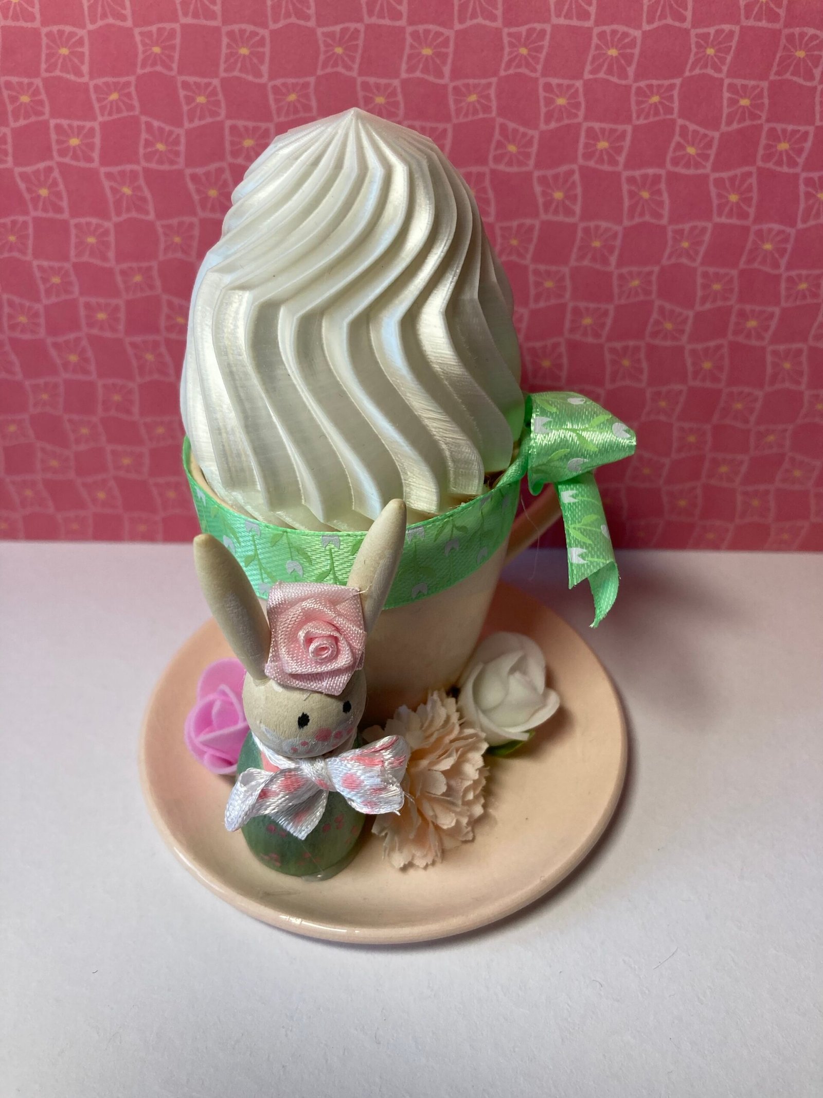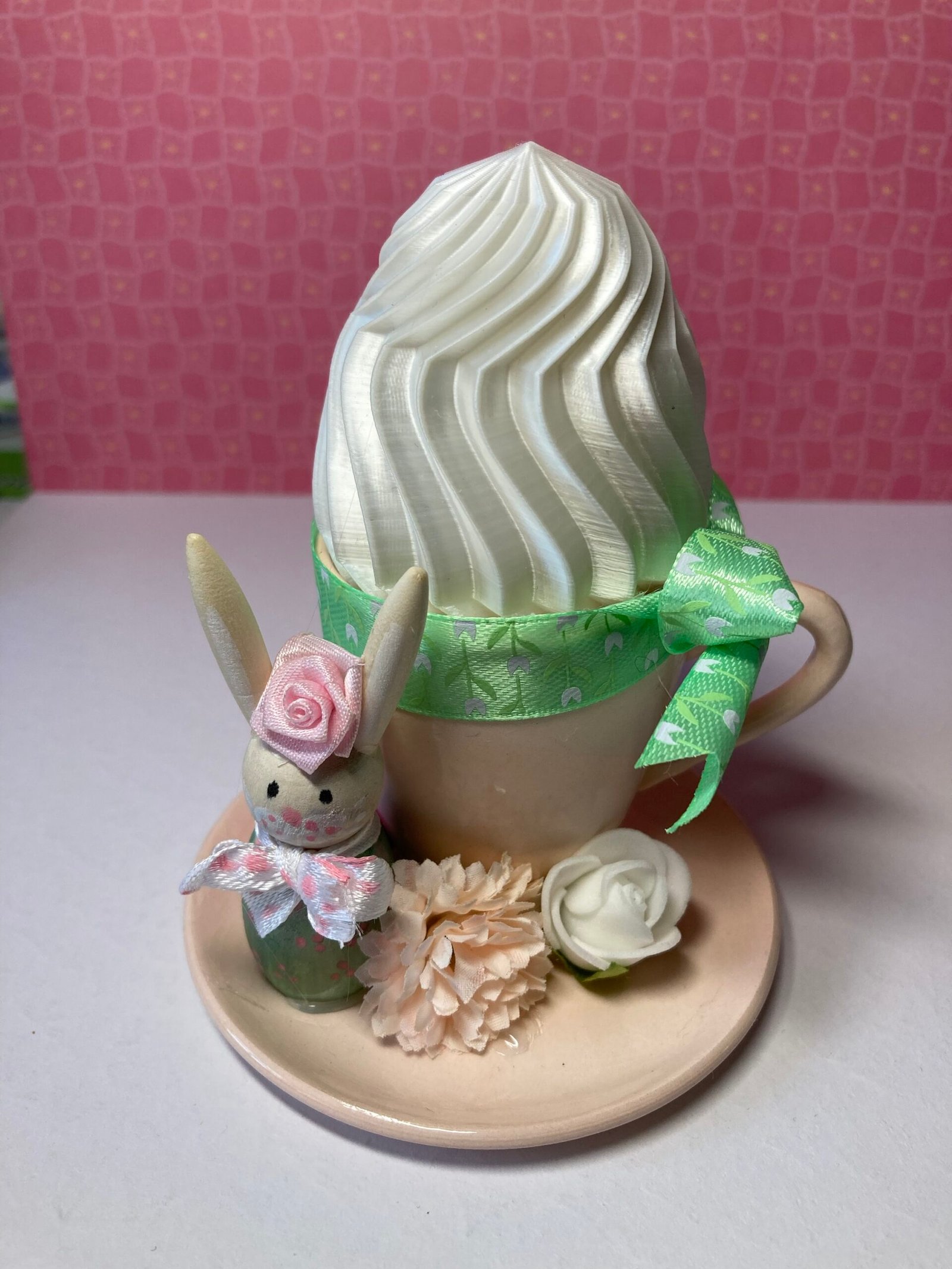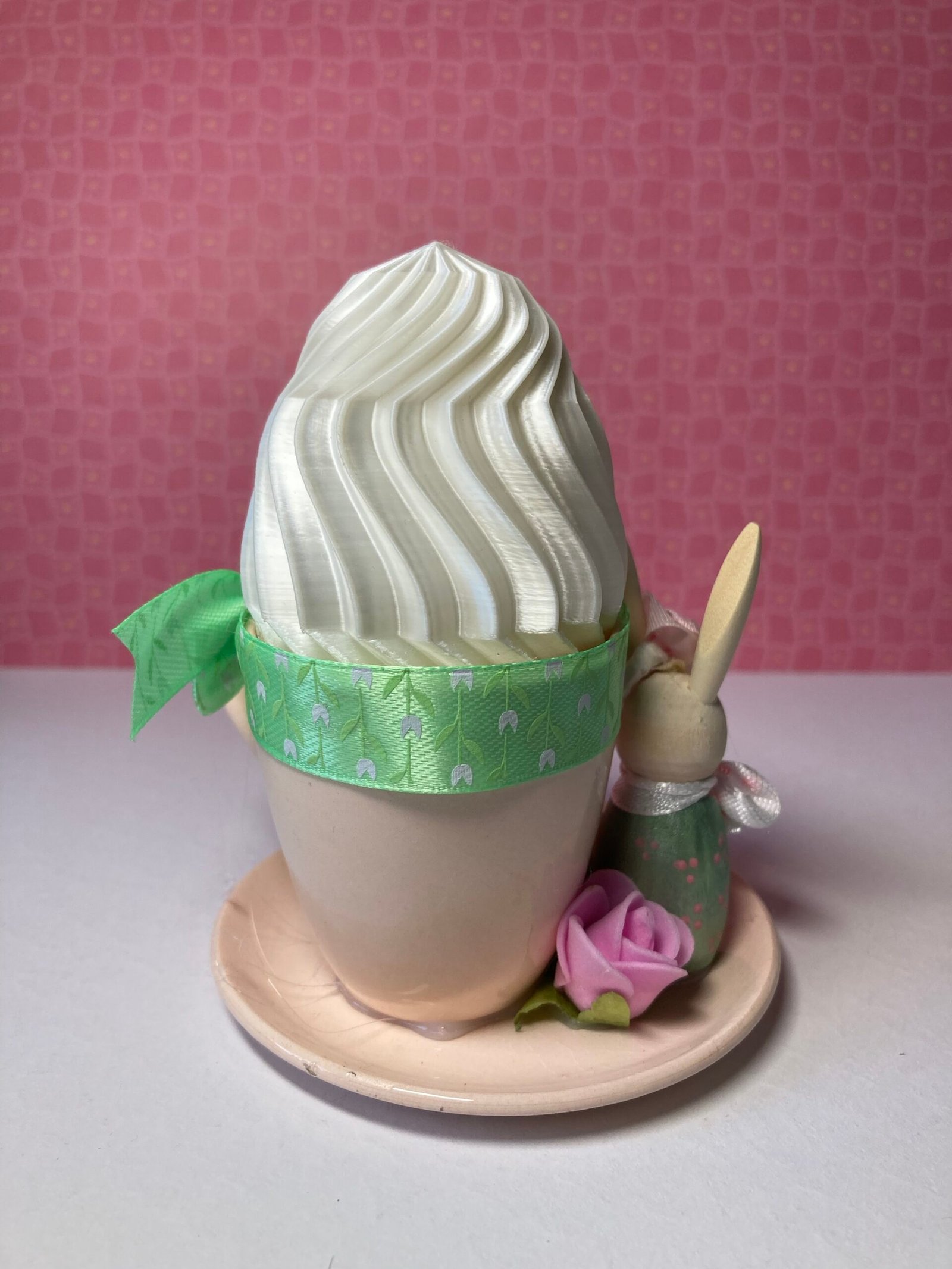 Tasse à café en céramique rose pale surmontée d’un œuf de Pâques garni d’un ruban vert, d’un petit lapin en bois et de fleurs artificielles.